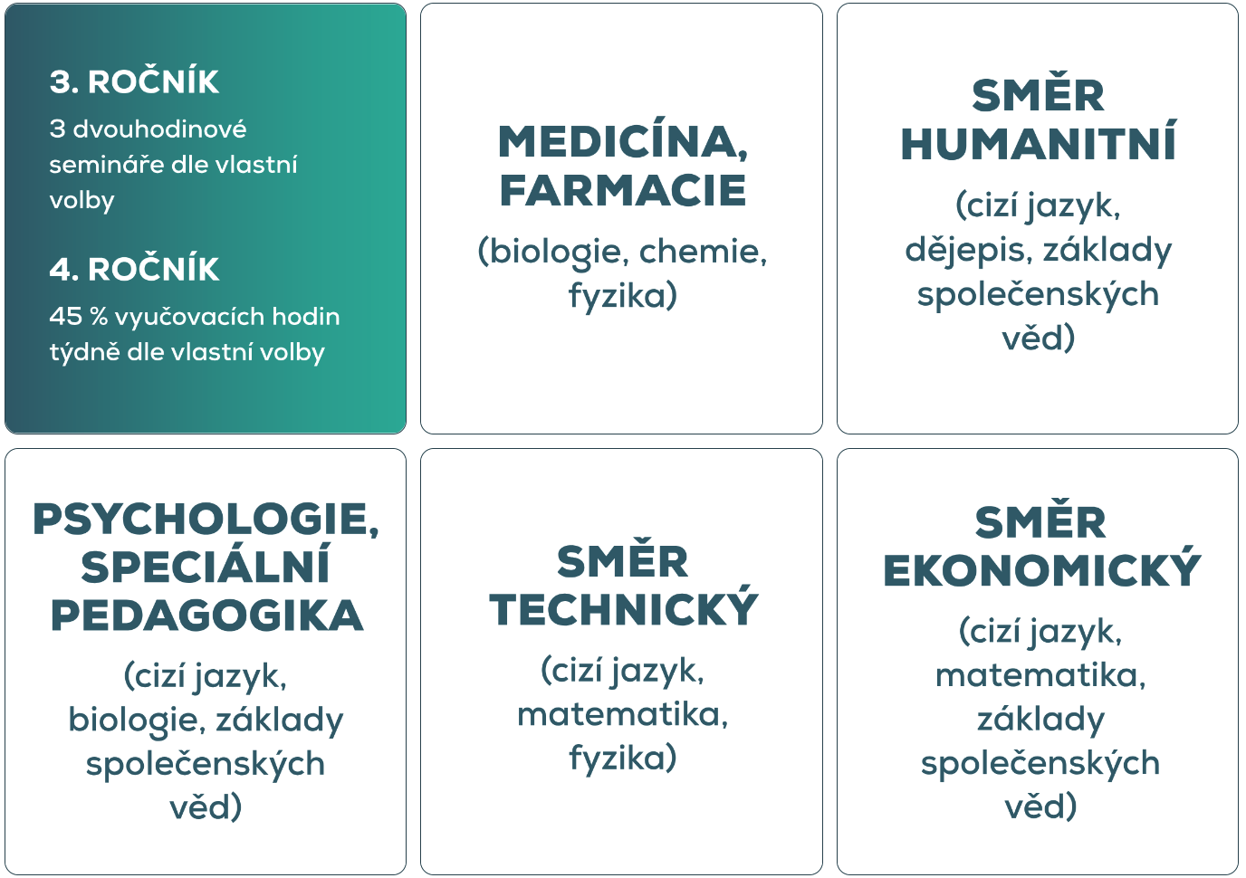 Ve třetím ročníku přichází první možnost specializace – studenti si vybírají tři semináře podle svých zájmů a silných stránek. Ve čtvrtém ročníku už mohou věnovat třináct hodin týdně volitelným předmětům, které je připraví na konkrétní vysokoškolský obor.