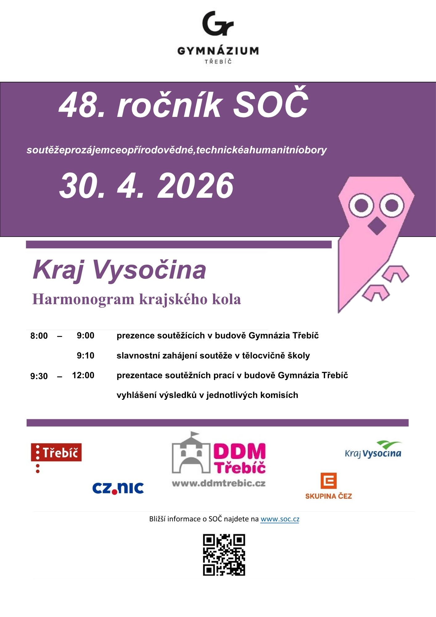 Ve čtvrtek 30. dubna proběhne na naší škole krajské kolo 48. ročníku soutěže Středoškolská odborná činnost (SOČ).